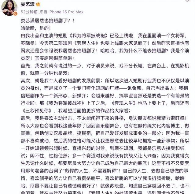 就在大家以为娄艺潇会就此沉寂时,她在2023年10月22日扔了个重磅消息:在社交平台上宣布,她要拍短剧了!这消息像块石头砸进水里,激起了不小的浪花。有人惊讶,有人疑惑,还有人觉得她“掉价”了。毕竟,短剧在很多人眼里,地位比不上正儿八经的电视剧。可娄艺潇却不这么想,她亲自在网上解释,说自己爱演戏,但现在机会少,短剧是个新方向,她还当了出品人,想试试新路子。